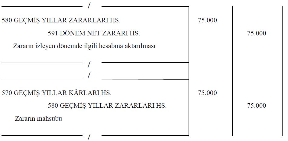 İşletmenin 690 Dönem Kârı veya Zararı hesabı borç kalanı veriyorsa yani dönemin giderleri, gelirlerinden daha fazla ise bu fark 690’nın alacağına yazılarak 692 Dönem Net Kârı veya Zararı hesabının borcuna aktarılır. Daha sonra bu net zararın, bilançoda da yer alabilmesi için tutarın 692’nin alacağına bilanço hesabı olan 591 Dönem Net Zararı (-) hesabının borcuna kaydedilmesi gerekmektedir. Yanında eksi işareti olan bu hesap bilançoda öz kaynakları azaltan bir indirim biçiminde gösterilmektedir. İzleyen dönemin başında ise 580 Geçmiş Yıllar Zararları (-) hesabının borcuna aktarılarak kapatılır.