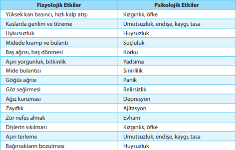 Stresin psikolojik ve fizyolojik etkileri tablodaki şekilde sıralanabilir.