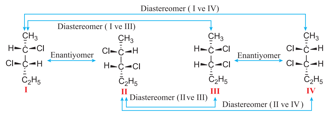 2,3-Dikloropentan bileşiğinin enantiyomer ve diastreoizomer ilişkisini gösteriniz.