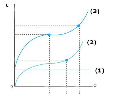 Şekilde 1 numara ile gösterilen eğri Toplam Sabit Maliyetleri (TFC) göstermektedir. Eğrinin dikey ekseni kestiği nokta sabit maliyet toplamına eşittir ve üretim miktarı ne olursa olsun bu değişmemektedir.
