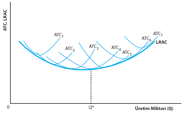 Şekildeki LRAC eğrisi uzun dönem ortalama maliyet eğrisidir. Eğri Q* ’ın solunda kalan üretim düzeyleri (yani LRAC’nin azaldığı üretim düzeyleri) için kısa dönem ortalama toplam maliyet (ATC) eğrilerine söz konusu eğrilerin minimum noktalarının solunda kalan bölgelerde teğettir. Q* ’ın sağında kalan üretim düzeyleri (yani LRAC’nin arttığı üretim düzeyleri) için kısa dönem ortalama toplam maliyet (ATC) eğrilerine söz konusu eğrilerin minimum noktalarının sağında kalan bölgelerde teğettir. Uzun dönemde ortalama maliyet eğrisinin “U” biçiminde olmasının nedeni firmaların üretim sürecinin başlangıcından belli bir üretim seviyesine kadar ölçek ekonomileriyle çalışıyor olması ve daha sonraki üretim düzeylerinde ise negatif ölçek ekonomileriyle çalışıyor olmasıdır. Uzun dönem ortalama maliyet (LRAC) eğrisi aynı zamanda ölçek eğrisi olarak da çağrılmaktadır. Buna göre Q*’ın solunda ölçek ekonomileri varken, sağında kalan bölgede negatif ölçek ekonomileri söz konusudur. Firma en düşük (minimum) ortalama maliyet düzeyine Q* üretim düzeyinde ve ATC4 eğrisinin temsil ettiği üretim ölçeğinde ulaşmaktadır. En düşük maliyetle üretimin gerçekleştirildiği üretim ölçeğine optimum (ideal) üretim ölçeği denir.