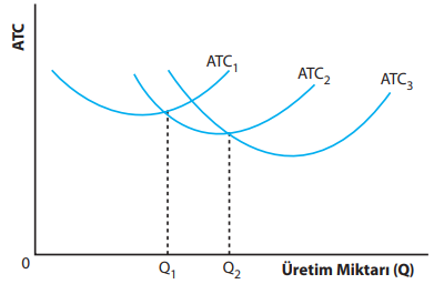 Şekilde üç ayrı işletme büyüklüğüne ilişkin kısa dönem ortalama toplam maliyet (ATC) eğrileri gösterilmektedir. ATC1 , ATC2 , ve ATC3 sırasıyla küçük, orta, ve büyük ölçekteki bir fabrikaya ilişkin kısa dönem ortalama toplam maliyetleri göstermektedir. Q1 üretim düzeyine kadar firma üretim için küçük ölçekteki bir fabrikayı; Q1 ve Q2 arasında kalan bir üretim düzeyi için orta ölçekteki bir fabrikayı; Q2 ’den daha fazla olan bir üretim düzeyi için büyük ölçekteki bir fabrikayı tercih ederek söz konusu üretim düzeylerini en düşük maliyetle gerçekleştirmiş olacaktır.