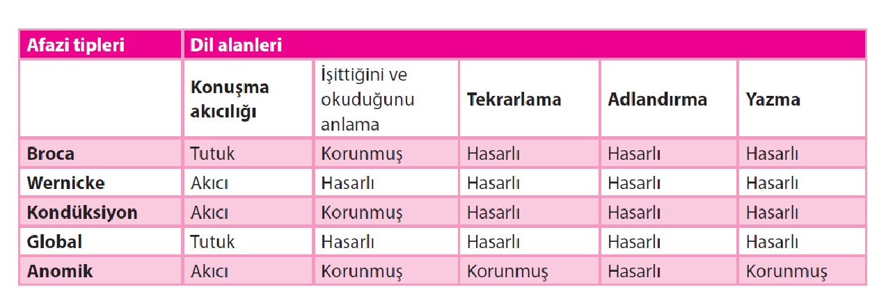 Afazi tipleri ile dil alanları arasında nasıl bir ilişki vardır?