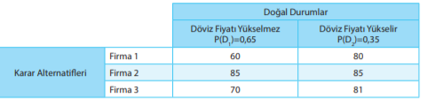 Tablo 3.3 incelendiğinde doğal durumların ortaya çıkma olasılıkları verildiği için karar vericinin risk ortamında karar verme durumunda olduğu gözlenebilir. Dolayısıyla her satır için beklenen değer, sonuç değerlerinin doğal durumların ortaya çıkma olasılıkları ile çarpılması ve bu değerlerin toplanması yolu ile bulunabilir. Firma 1 karar alternatifi için beklenen değer 0.65 (60) + 0.35 (80) = 67, Firma 2 karar alternatifi için beklenen değer 0.65 (85) + 0.35 (85) = 85 ve Firma 3 karar alternatifi için beklenen değer 0.65 (70) + 0.35 (81) = 73.85 olacaktır. Karar problemi maliyet yapılı olduğundan, beklenen değerlerden en küçüğü olan 67 maliyet değeri ile en iyi kararın Firma 1’in seçimi olduğu kolayca görülebilmektedir.
