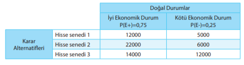 Bir karar verici üç farklı hisse senedinden birine yatırım yapmak istemektedir. Karar verici önümüzdeki dönem için ekonominin %75 olasılıkla iyi durumda, %25 olasılıkla ise kötü durumda olacağını tahmin etmektedir. Yatırımcı üç hisse senedine yapacağı yatırım değerlerinden elde edeceği kazancı tespit etmiştir. Yatırımcının farklı hisse senedi seçenekleri ve doğal durumlar için beklediği kazanç değerleri Türk Lirası olarak Tablo 3.1’de gösterilmiştir.