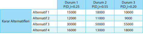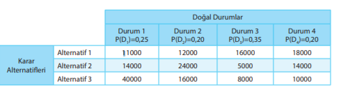 Tablo 3.6’da yer alan doğal durumlar incelendiğinde en büyük olasılık değerinin 0.55’e eşit olduğu ve bu olasılığın 2 numaralı doğal duruma ilişkin olduğu görülmektedir. Buna göre diğer doğal durumlar göz ardı edilerek, Durum 2’de en düşük maliyete karşılık gelen değerin 11000 olduğu ve dolayısıyla en iyi kararın da Alternatif 2’yi uygulamak olduğu kolayca görülebilecektir.