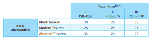 Tablo 3.5’de yer alan pazar koşul olasılıkları incelendiğinde en büyük olasılık değerinin 0.65’e eşit olduğu görülmektedir. Dolayısıyla karar verici tarafından en büyük olasılık değerine sahip olan I numaralı pazar koşulunun ortaya çıkacağı varsayılır. numaralı pazar koşulunun gerçekleşmesi durumunda elde edilecek en yüksek kazanç değeri olan 33, Alternatif Tasarım için elde edildiğinden, bu problemde en büyük olasılık ölçütüne göre en iyi karar Alternatif Tasarım’ın uygulanmasıdır. Ancak strateji tablosu dikkatli bir şekilde incelendiğinde tablodaki en büyük kazanç değerinin 35 olduğu ve bu değerin III numaralı pazar koşulunun ortaya çıkması ve Klasik Tasarımın seçilmesi halinde elde edilebileceği görülmektedir. III numaralı pazar koşulunun ortaya çıkma olasılığı 0,20’dir. 0,65’e göre küçük olmakla birlikte gerçekleşme olasılığı imkansız değildir. Dolayısıyla problem tüm olasılık değerlerini hesaba katan, en iyi beklenen değer ölçütüne göre değerlendirilirse en iyi kararın; 29,55 değeri ile Klasik Tasarım olarak değişeceği görülmektedir.