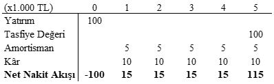 Yukarıda verilen projede oluşan net nakit akışları son satırda verilmiştir. Bu projeyi değerlendiren işletmenin %15 getiri beklediğini düşünürsek projenin net bugünkü değerini (NBD) hesaplayınız.