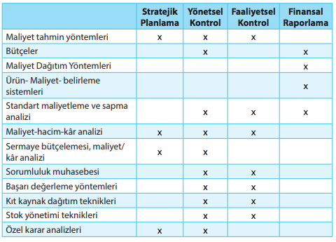 Yönetim muhasebesi, yönetimin değişik düzeylerindeki kararlarına bilgi sağlayan sistemin önemli bir parçası olarak bu konudaki sorumluluğunu yerine getirebilmek amacıyla birtakım yönetim muhasebesi tekniklerine sahiptir. Bu tekniklerin işletme yönetiminin gereksinmeleriyle ilişkilendirmesine örnek vermek üzere aşağıdaki tablo incelenebilir :