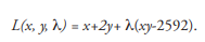 Let x and y be length and width of the designed camping area, respectively. Then the objective function, the fencing length is f (x, y) = x + 2y. The constraint of the area being 2592 m2 is written as xy = 2592, or xy -2592 = 0. Hence, then Lagrangian formulation is given by