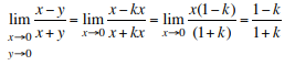 Here if we substitute x=y=0, we run into a problem, having 0/0 . Therefore, in order to resolve the singularity, we tend to the point (0,0) along a straight line of arbitrary slope, namely y=kx. Then, we have