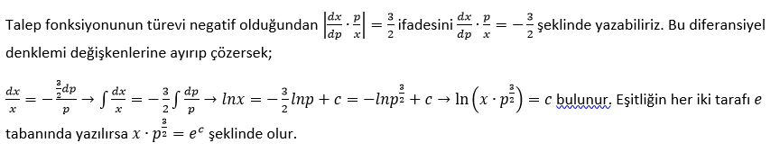 Bir malın talep fiyat esnekliği 3/2 olarak verildiğine göre bu malın miktarı ve fiyatı arasındaki ilişkiyi veren talep denklemini bulunuz.
