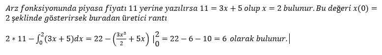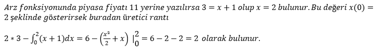 x miktarı ve p fiyatı göstermek üzere bir malın arz fonksiyonu p = x + 1 şeklinde verilmiştir. Piyasa fiyatı 3 olduğuna göre üretici rantını hesaplayınız.