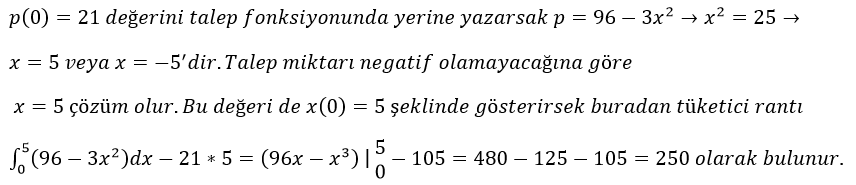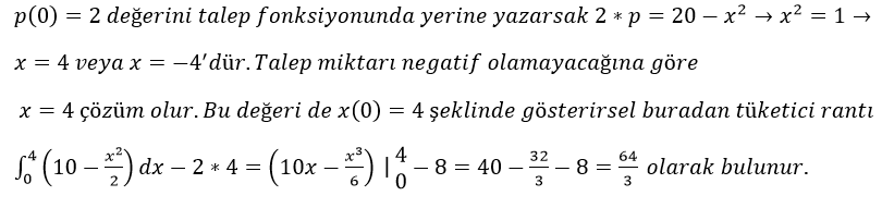 şeklinde verilmiştir. Buna göre p(0)=21 fiyatındaki tüketici rantı kaçtır?