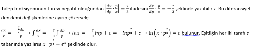 Bir malın talep fiyat esnekliği 7/3 olarak verildiğine göre bu malın miktarı ve fiyatı arasındaki ilişkiyi veren talep denklemini bulunuz.