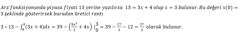 x miktarı ve p fiyatı göstermek üzere bir malın arz fonksiyonu p = 3x + 4 şeklinde verilmiştir. Piyasa fiyatı 13 olduğuna göre üretici rantını hesaplayınız.