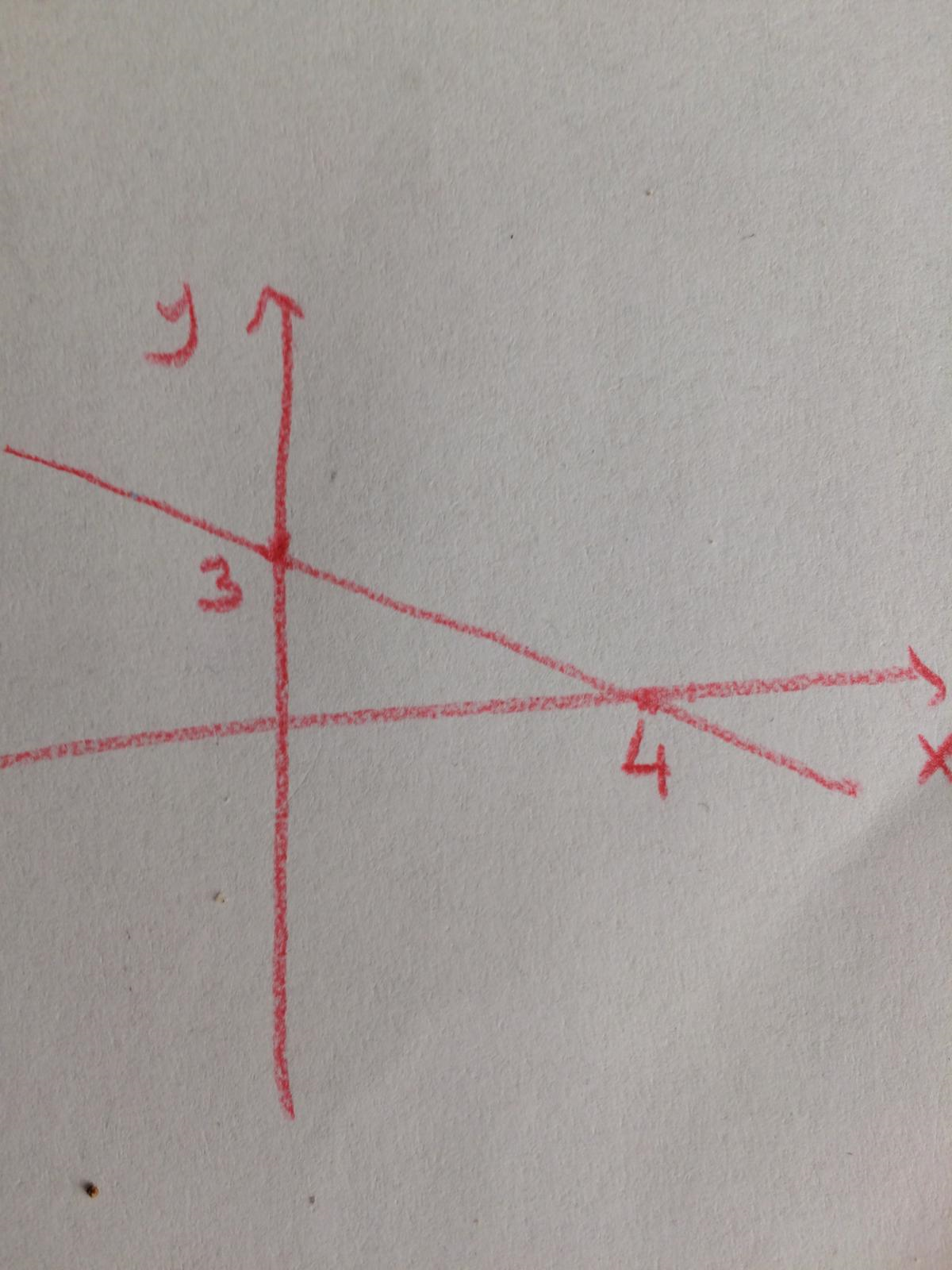 In order to draw the graph of an equation we have to find the intercepts on x and y axis. To find the x-intercept we take y=0 and find x. Thus 3x=12, x=4 is the x-intercept. To find the y-intercept we take x=0 and find y. Thus 4y=12, y=3 is the y-intercept. So the graph is: