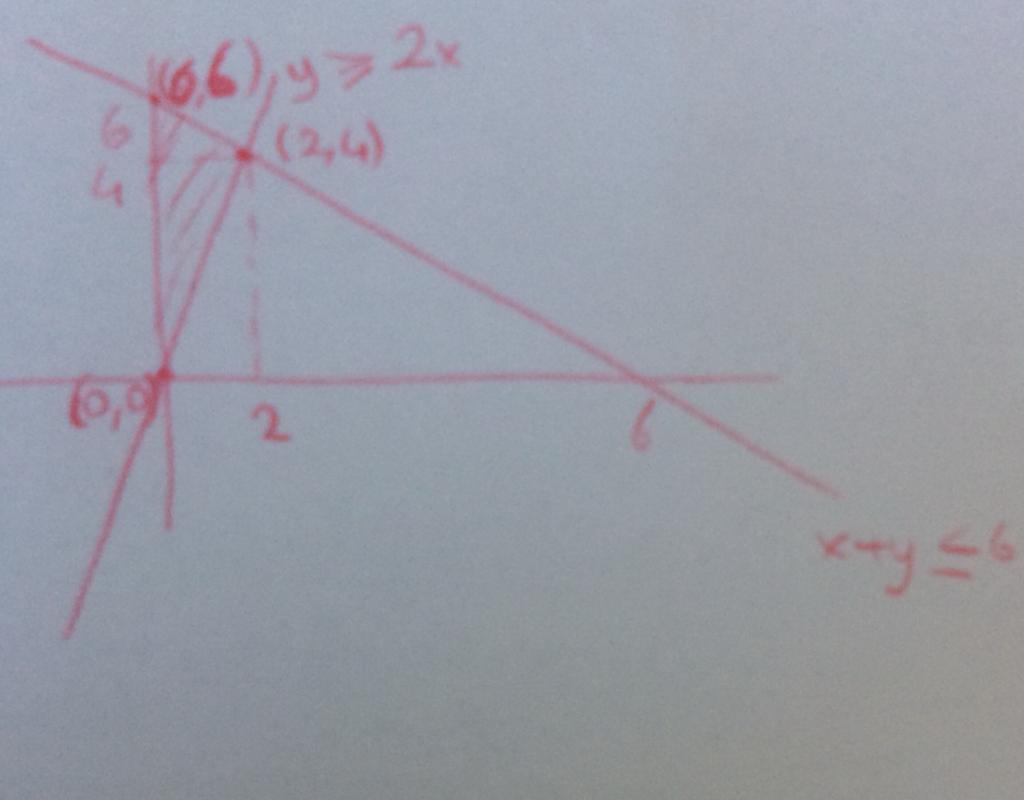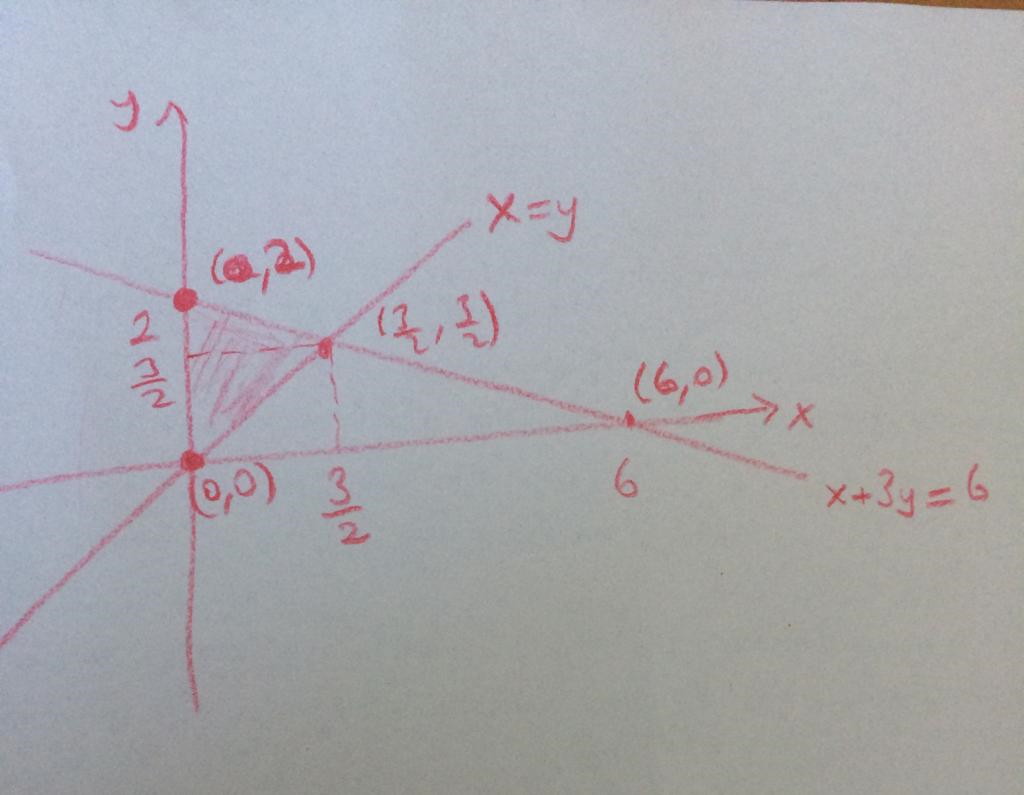 Thus x+3x=6 then x=y=3/2. Thus the intersection point, and hence one corner is point(3/2, 3/2). Another corner is (0,0) and the last corner is the y-intercept of x+3y=6 line which is (0,2). So the graph looks like: