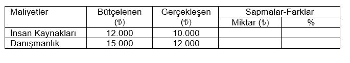 Yapılan proje maliyet kontrolü ile danışmanlık giderleri ₺15.000 olarak bütçelenmiş, ancak ₺12.000 olarak gerçekleşmiştir. Dolayısıyla ilgili gider kaleminde ₺3.000 olumlu fark ortaya çıkmıştır. Yüzde olarak ise: