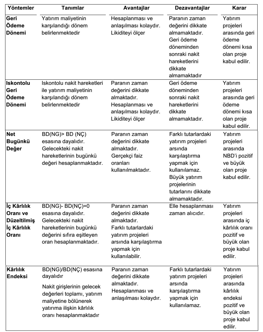 Yatırım projelerinin değerlendirilmesinde ve hangi yatırım projesinin yatırım bütçesine dâhil edilip edilmeyeceğinin belirlenmesinde kullanılan yöntemler nelerdir?