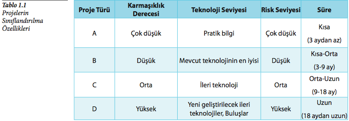 Proje Süresi: Projeler proje sürelerine göre; Kısa (3 aydan daha kısa), Kısa-Orta (3 aydan daha uzun 9 aydan daha kısa), Orta-Uzun (9 aydan daha uzun 18 aydan daha kısa) ve Uzun (18 aydan daha uzun) olarak sınıflandırılabilir.