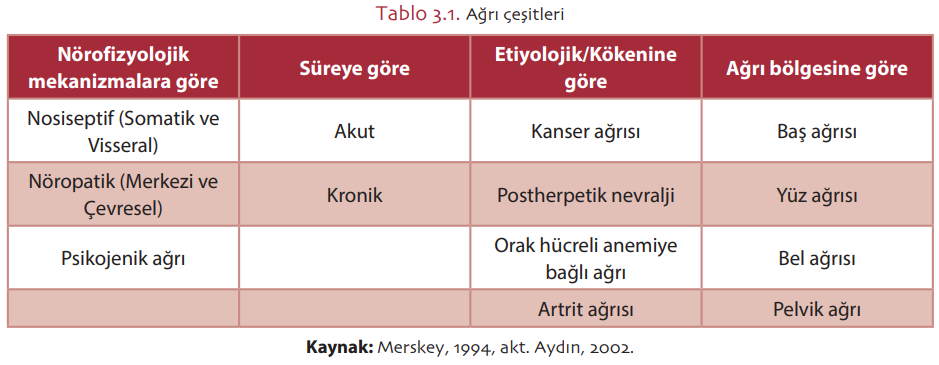 - Akut Ağrı: Her zaman sinir sistemi dışında kalan yani nosiseptif niteliktedir (Aydın, 2002). Nedeni vücuttaki bir travma, enfeksiyon ya da doku kaybı ile ilişkilidir.