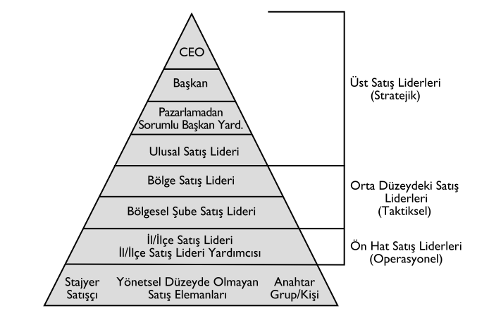İşletmeler ve özellikle de büyük ölçekli olanlar birçok yönetim düzeyine sahiptir. Önceden yer verilen satış yönetimi işlevlerini işletmedeki her bir yönetim düzeyi için işletmek zorunludur. Satış yöneticisinin işinin en önemli belirleyicilerinden biri organizasyon hiyerarşi düzeyidir. Bu anlamda, genel itibariyle üç hiyerarşi düzeyinden bahsedilebilir. Bunlar stratejik ya da üst (tepe) yöneticileri, taktiksel ya da orta düzeydeki satış yöneticileri ve operasyonel ya da ön hat yöneticileri (birinci basamak yöneticileri) biçiminde ifade edilebilir (Futrell, 2001). Aşağıdaki şekilde, örgütsel hiyerarşide yer alan satış yöneticisi ya da lideri düzeyleri görülmektedir.