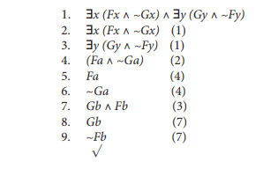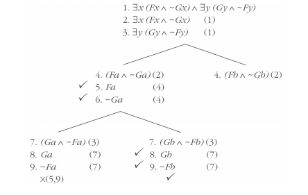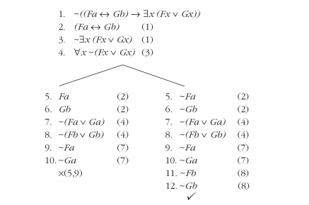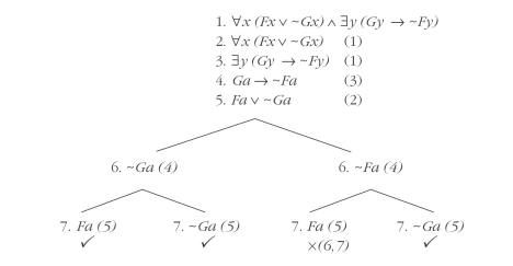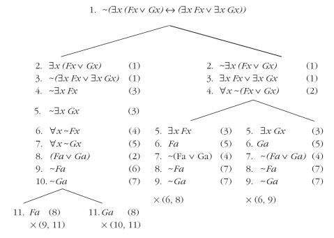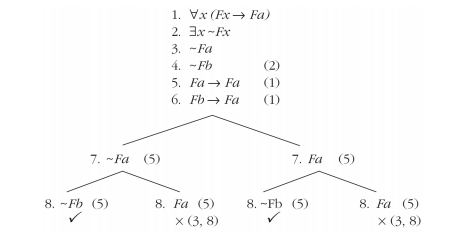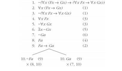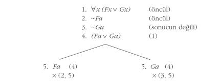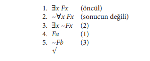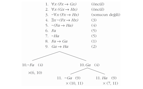 Önermenin değilinde ad sembolleri yerine birer eleman yazarak oluşturulan ifadeyi kök noktasına yazarak oluşturulan çizelgede tüm dallar kapanmalıdır.