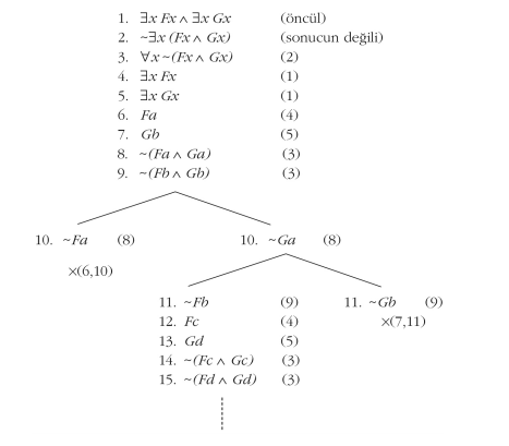 Kök noktasından başlayarak, öncüllerde ve sonucun değilinde ad sembolleri yerine birer eleman yazarak oluşturulan ifadeleri yazarak oluşturulan çizelgede tüm dallar kapanmalıdır.