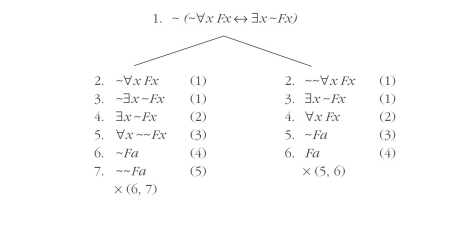 ~∀ν A ve ∃ν ~A önermeleri niceleme mantığında eşdeğer önermeler olduğundan, daldaki bir üst noktada ~∀ν A ifadesi varsa, o dalda bir nokta olarak ∃ν ~A ifadesi eklenir