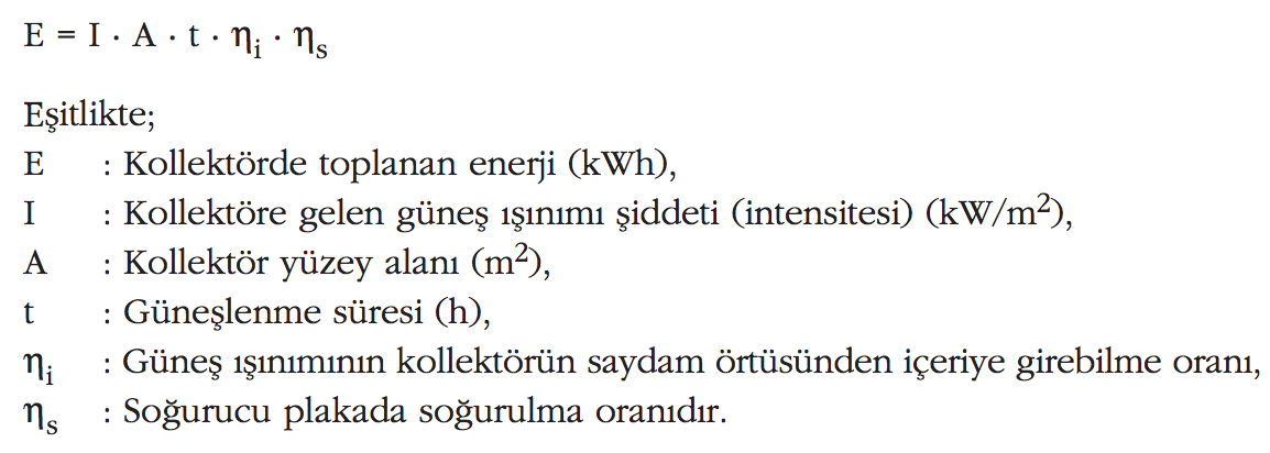Düz yüzeyli bir güneş kollektöründe toplanan enerji değeri aşağıdaki eşitlikle hesaplanabilir:
