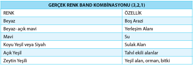 Renkli görüntü kavramı: 1. band bir anlamda kırmızı filtrelenmiş, başka bir deyişle orijinal görüntüdeki gri değerler, kırmızının tonları şeklinde ifade edilmiştir. Benzer şekilde 2. ve 3. bandlar da yeşilin ve mavinin tonları şeklinde ifade edilip üstüste çakıştırılmış ve oluşan renk karışımından da doğal renkler elde edilmiştir.