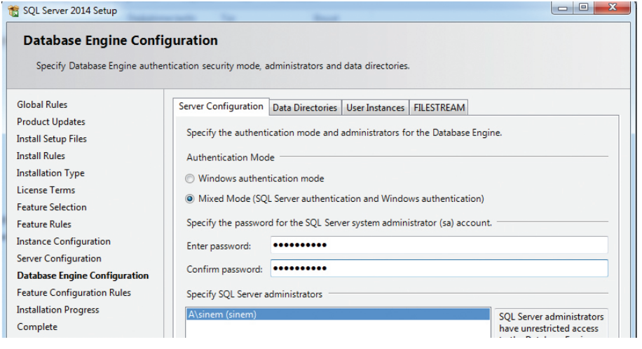 Veritabanı Motoru Yapılandırması (Database Engine Configuration): Bu adımda, MS SQL Server 2014 veritabanı motoru servisine yönetici olarak erişirken kullanılacak kimlik doğrulama yöntemi belirlenir. Resimde gösterilen “Mixed Mode (SQL Server authentication and Windows authentication)” seçeneği ile hem Windows kullanıcılarını hem de SQL kullanıcısı tanımlanarak devam edilebilir. “Data Directions” sekmesinde veritabanı, veri, yedek gibi içeriklerin bulunacağı varsayılan dizinler listelenir. İstenilen değişiklikler yapılabilir.