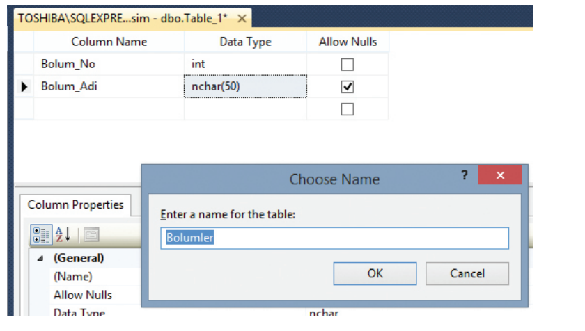 Bolumler(Bolum_No, Bolum_Adi) şemasına uygun olarak resimdeki gibi alan isimleri ve uygun veri tipleri tanımlanır. Ayrıca veri tekrarı olmaması istenen alanlar için birincil anahtar tanımlaması yapılması gerekir. “Bolum_No” satırına gelip sağ tıklayarak “Set Primary Key” ile birincil anahtar ataması yapılabilir. Sonra menüden Save(Kaydet) dendiğinde tablo ismi girilir. Eğer herhangi bir alan için mutlaka tanımlı bir değer olması isteniyorsa “Allow Nulls” u seçmemek gerekir.
