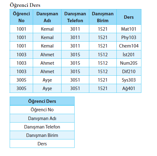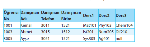 düzelir. Veritabanı 3NF’ye dönüştürüldüğünde üç aykırılıkta kaldırılmış olur. Ekleme aykırılığı tabloya veri eklenmek istendiğinde ilave veri veya bilgiye ihtiyaç duyulması anlamına gelir. Silme aykırılığında ise tablodan