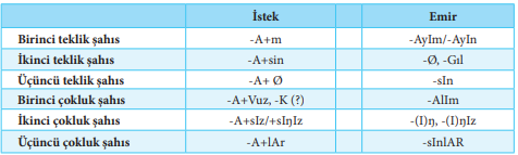 İstek ve emir kiplerini oluşturan ekler aşağıdaki tabloda gösterilmiştir: