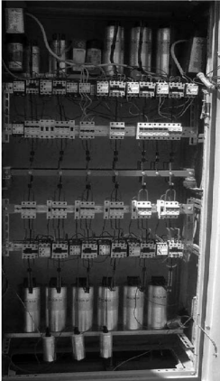 Görselde elektrik kuvvet tesislerinde bulunması zorunlu olan kompanzasyon rölesi ve panosu görülmektedir. Şemadan da görüleceği gibi, kondansatörler metal kılıflı olup yangına karşı plastik kılıflılardan daha emniyetlidirler. Kompanzasyon sistemini kontrol eden rölenin, kondansatörleri devreye kontaktörler üzerinden aldığı görülmektedir.
