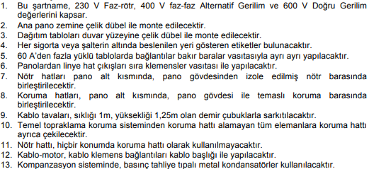 Elektrik Tesisat Yönetmeliklerine uygun olarak, elektrik tesisat projesinin uygulama esaslarını belirler. Görselde örnek projeye uygun bir teknik şartname gösterilmiştir.